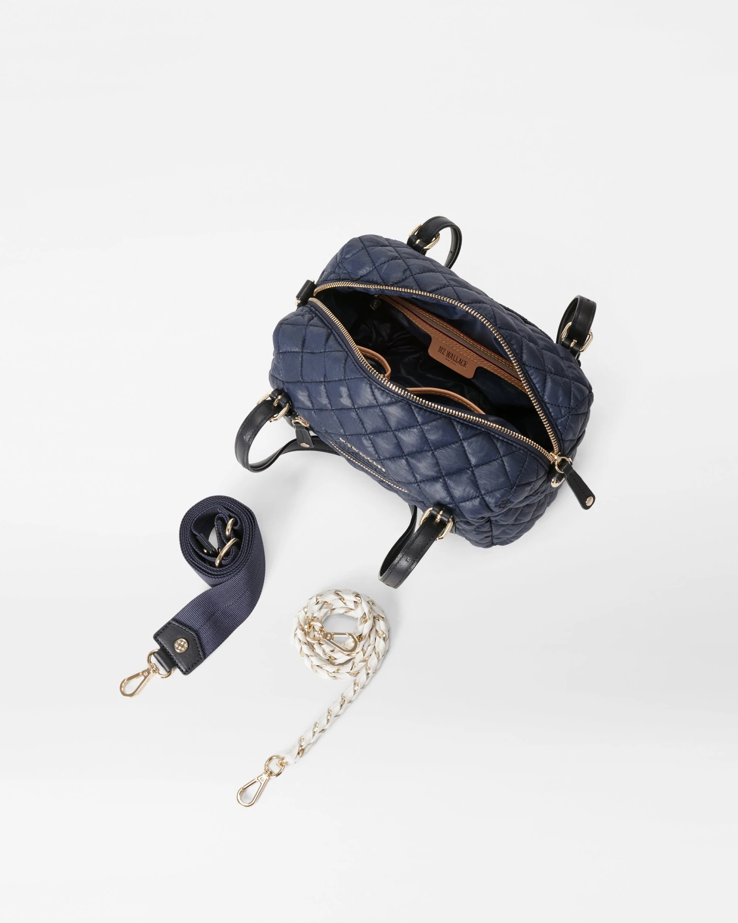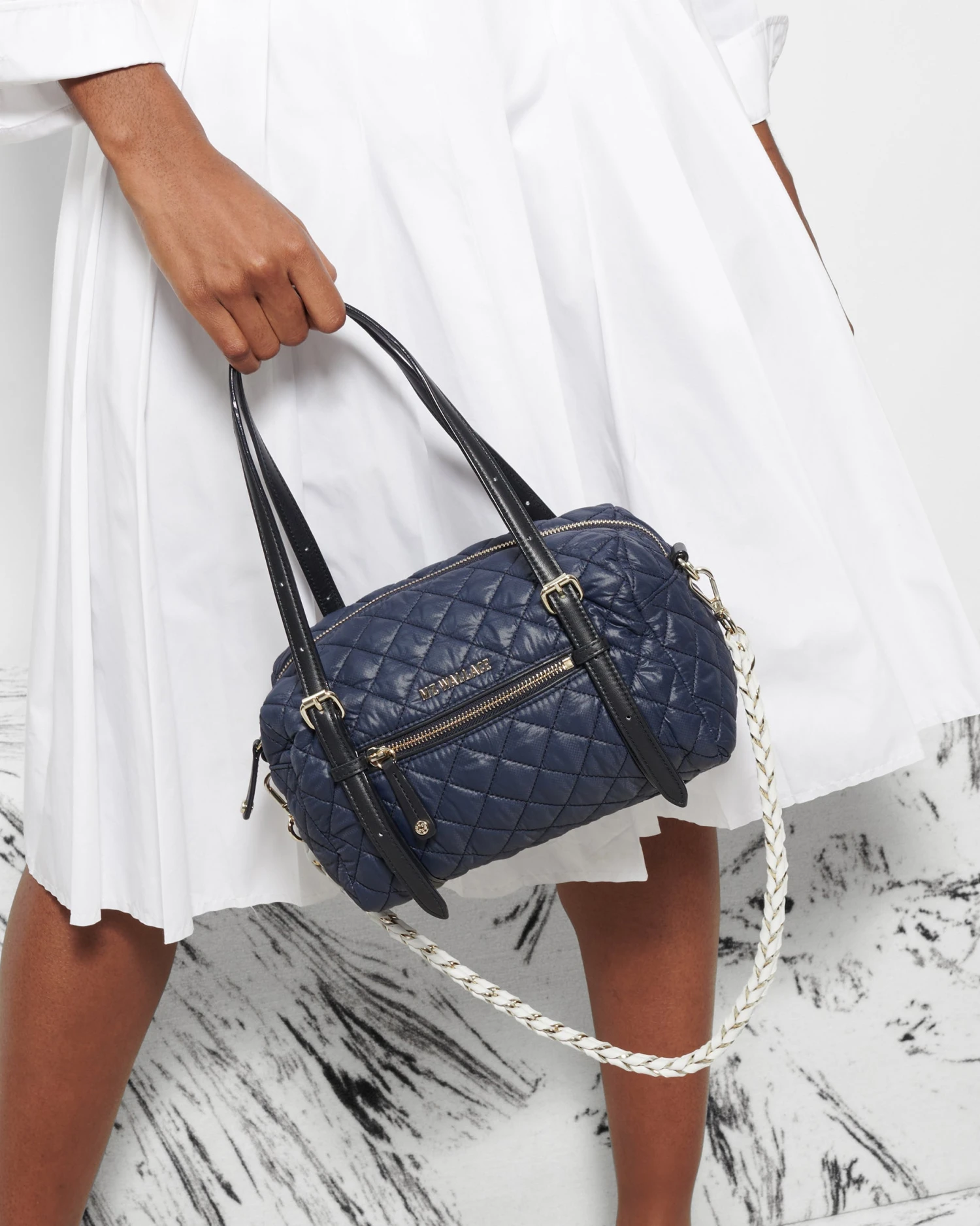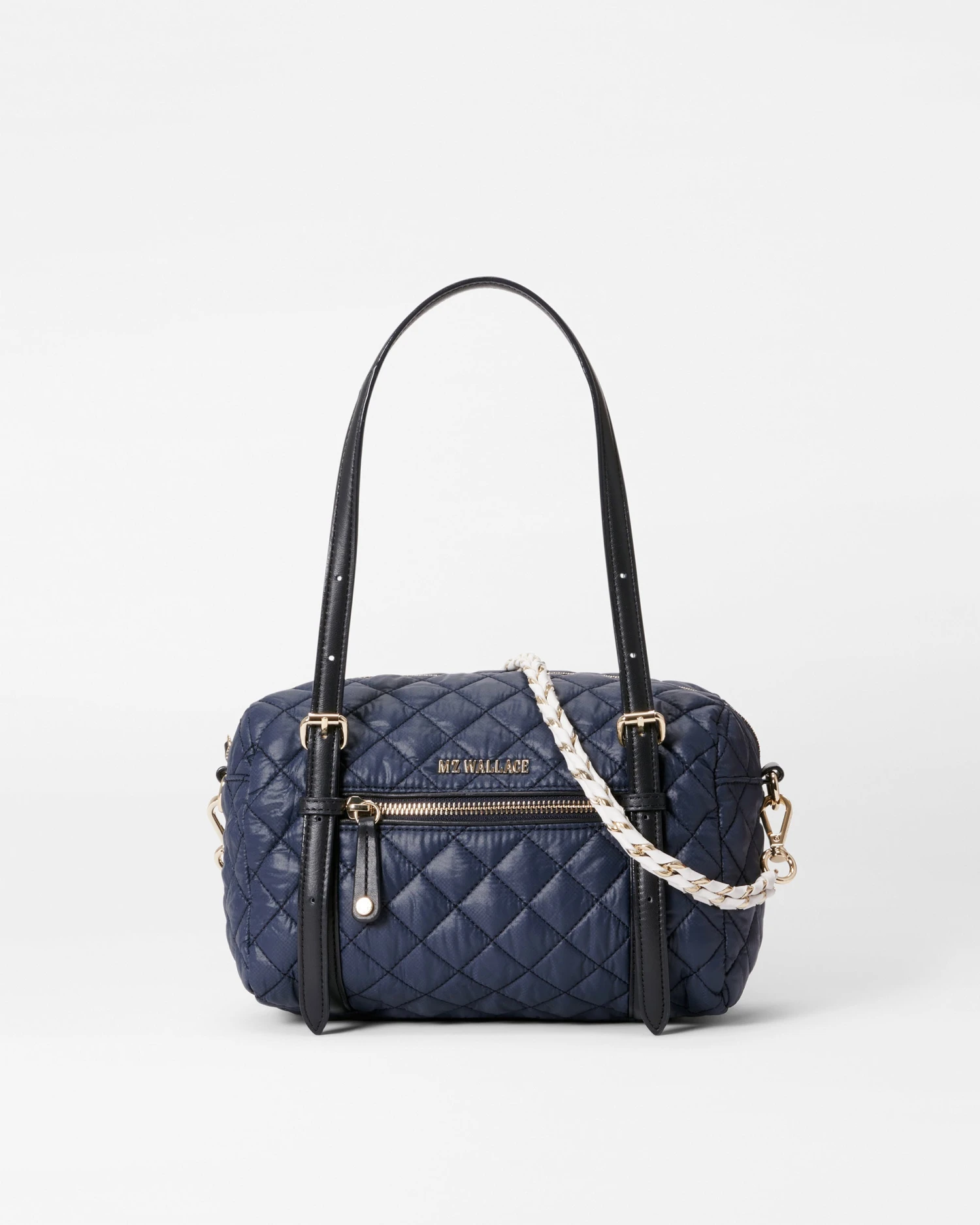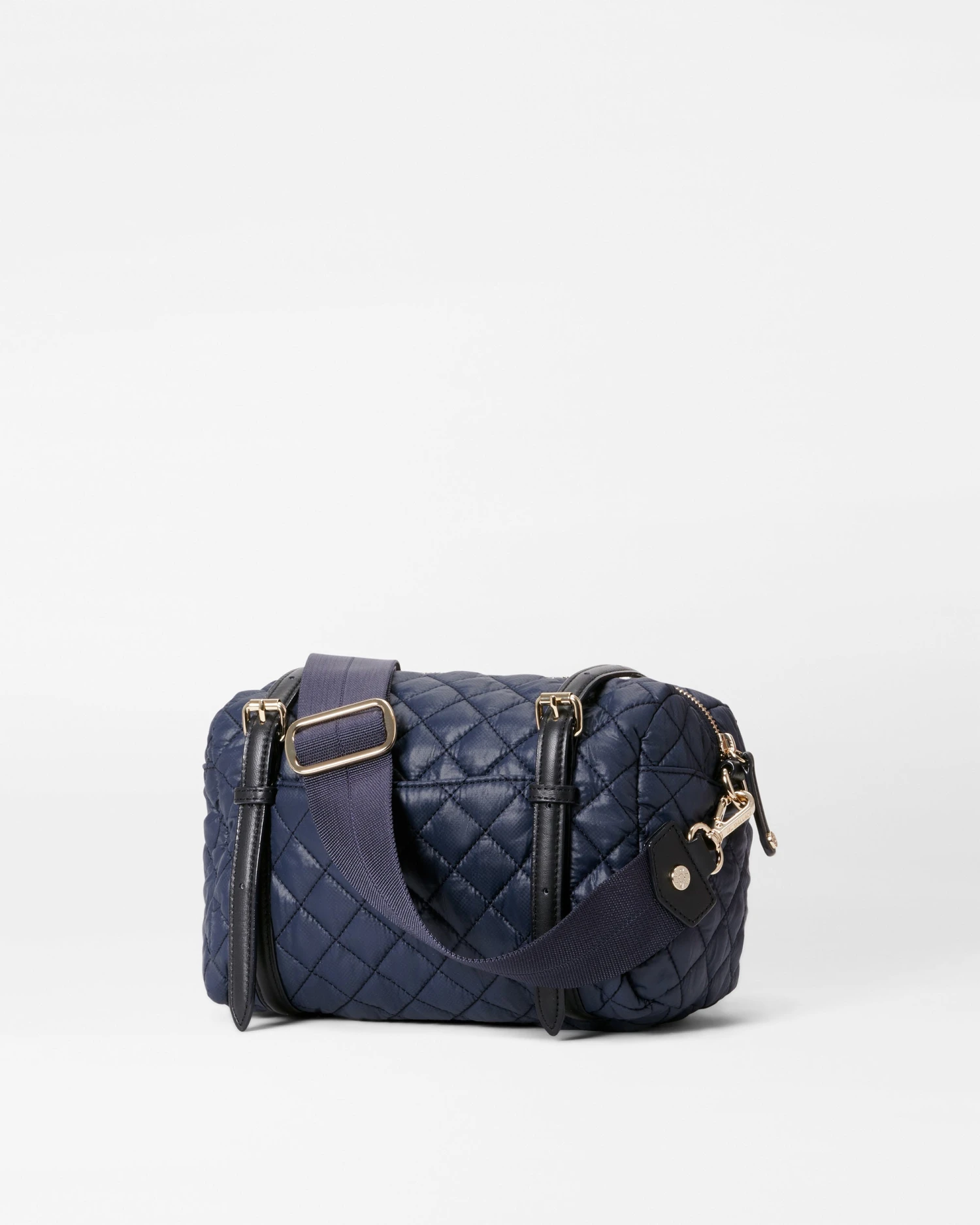 Like a barrel—but better, with two adjustable leather handles, seven pockets, a zip top closure, a detachable chain and leather strap, a detachable leather wrapped chain strap, a detachable, adjustable nylon crossbody strap and a 100% recycled nylon fabrication.