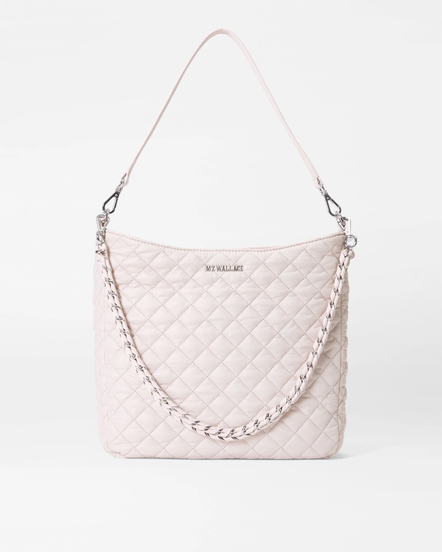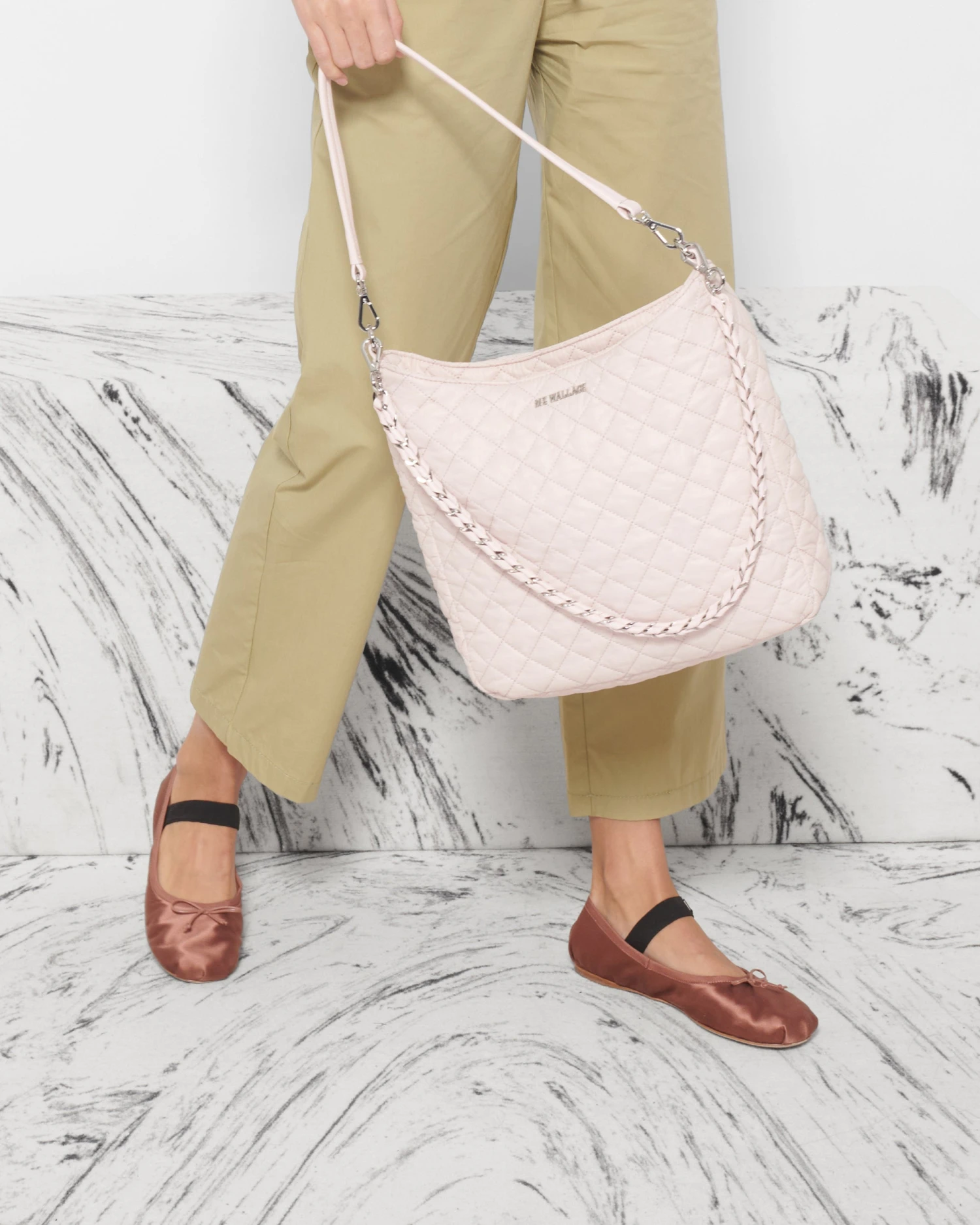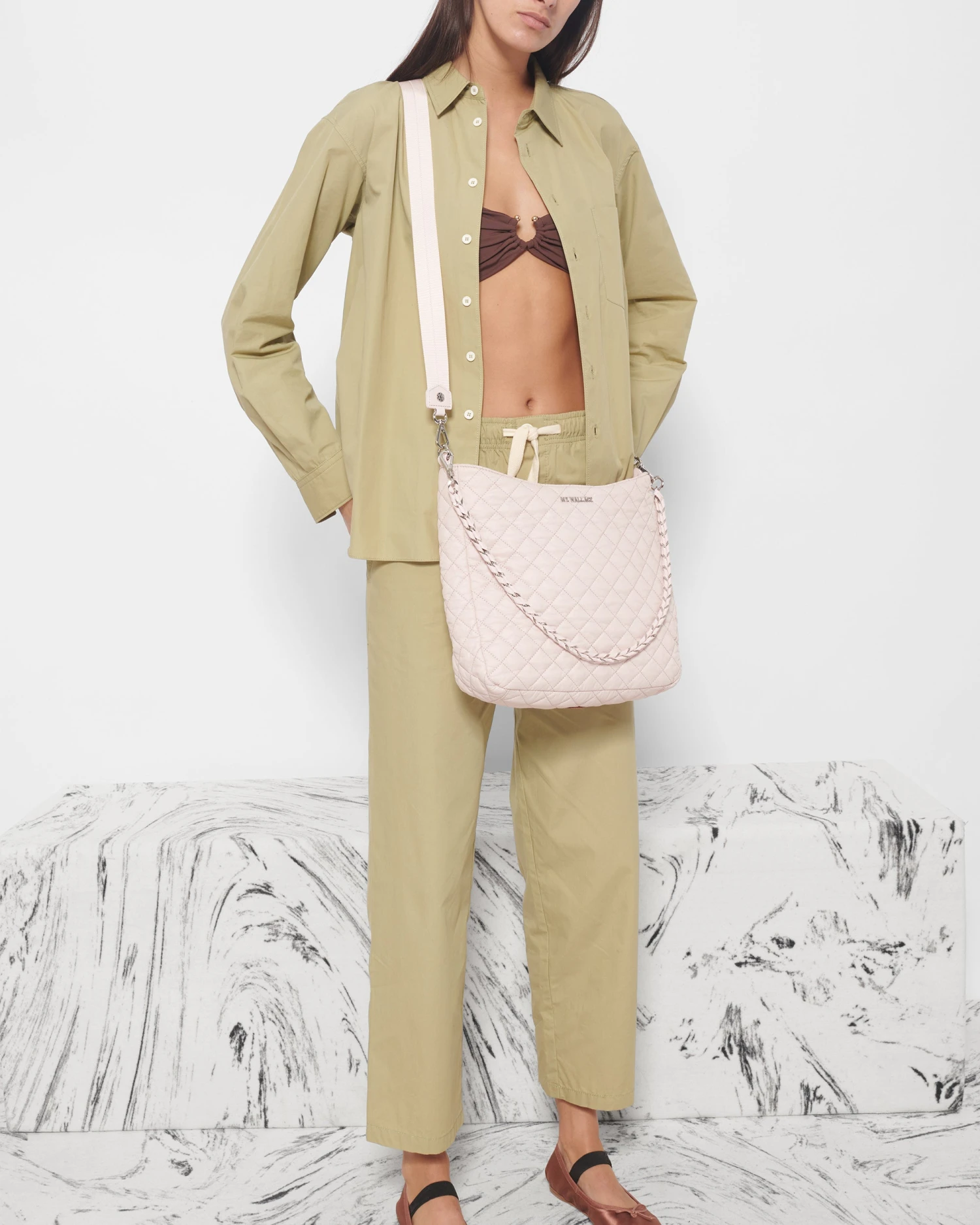 The streamlined Crosby Hobo has sleek lines and a modern look for everyday wearability. Featuring our iconic quilting, the Crosby Collection’s signature three strap design, Italian Leather accents and a 100% recycled nylon fabrication.