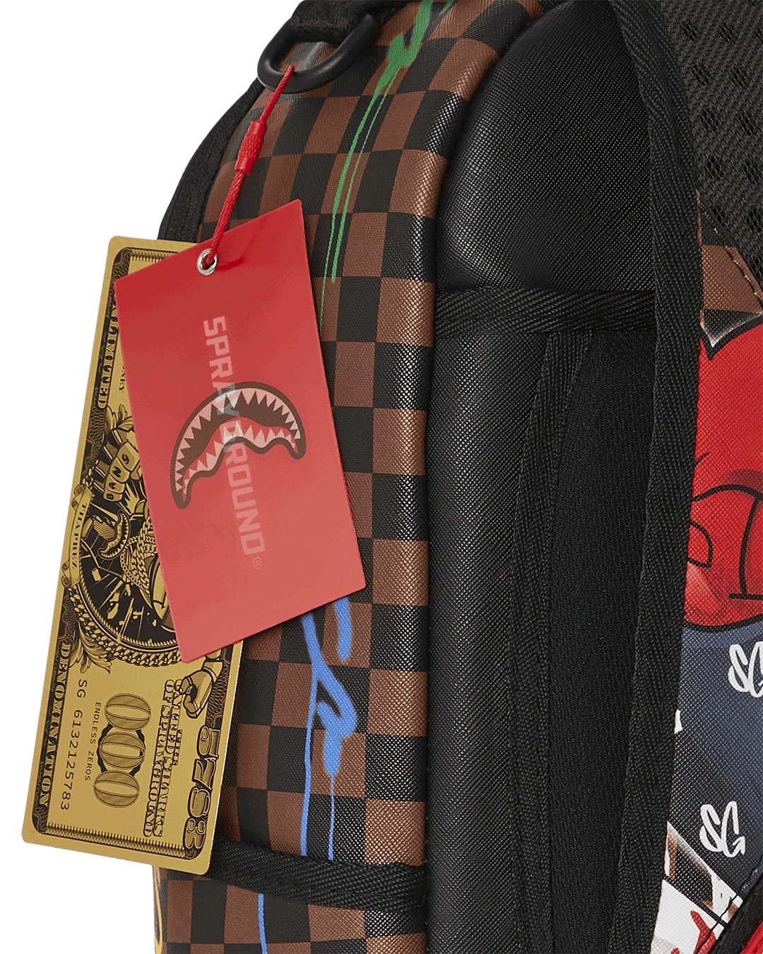 Dimensions: 18″ x 6″ x 11.5″ • Front zipper pocket • Side pockets • Zippered Stash pocket • Separate velour sunglass compartment • Ergonomic mesh back padding • Adjustable Straps for custom sizing • Gold zippers with metal hardware • Metal “Sprayground Authentic” badge • Slide through back sleeve connects to carry-on luggage to free your hands