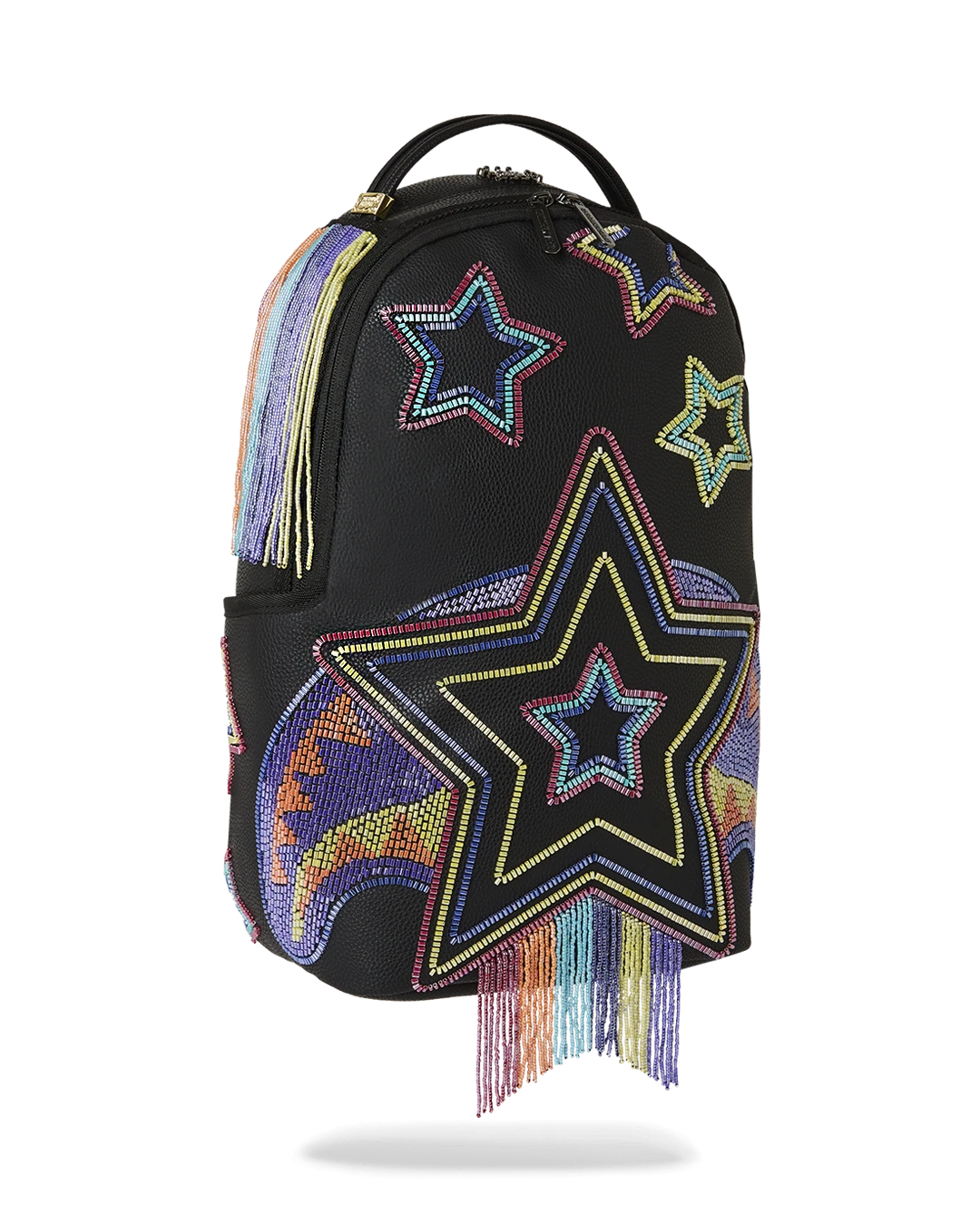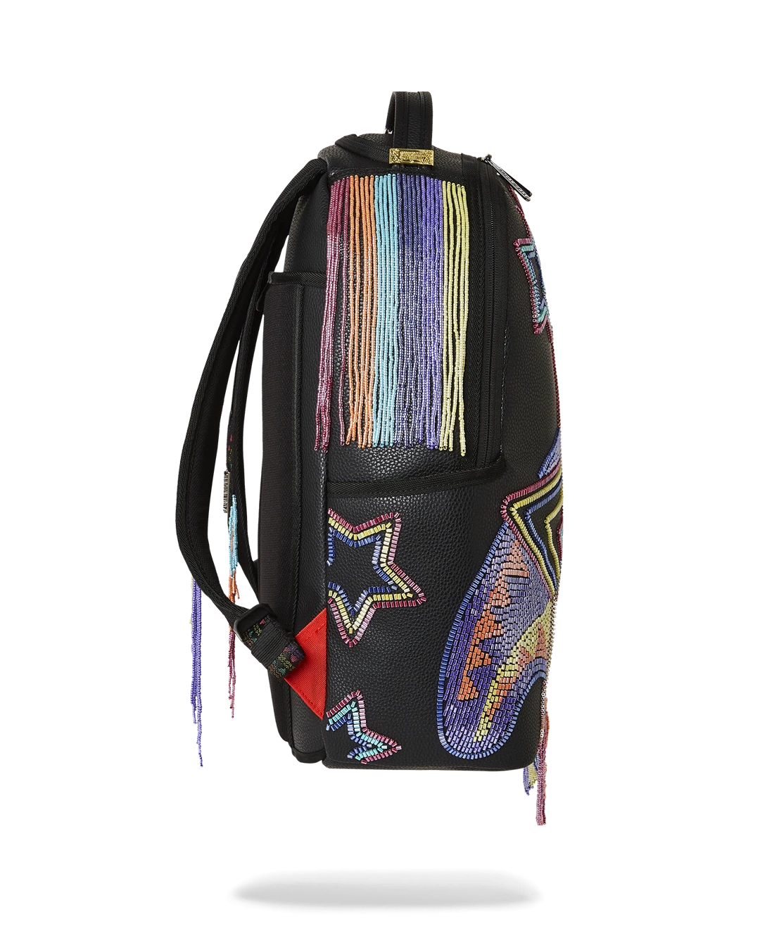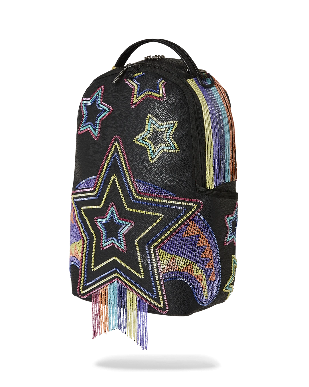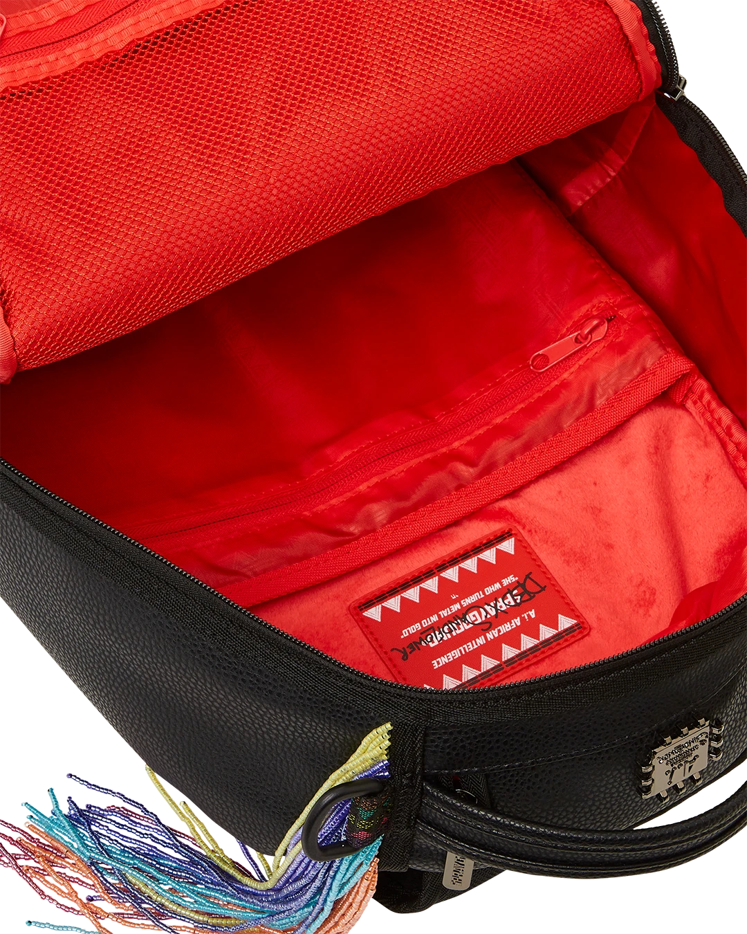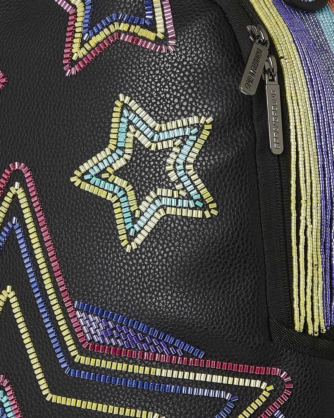 The coveted collection features the standout design; an eye-catching star print that is crafted from beads and is embedded perfectly on each of the items in this capsule . The Ai collection has been known for, vibrant purples, reds and yellows that speak to the colorful inspirations of Afro-futuristic art and culture. The exquisitely crafted beaded design speaks to this as well and is beautifully cascading off of Sprayground’s iconic collectible art piece – the shark mouth print on both backpacks.