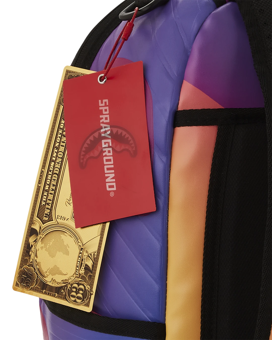 Dimensions: 18″ x 6″ x 11.5″ • Front zipper pocket • Side pockets • Zippered Stash pocket • Separate velour sunglass compartment • Ergonomic mesh back padding • Adjustable Straps for custom sizing • Gold zippers with metal hardware • Metal “Sprayground Authentic” badge • Slide through back sleeve connects to carry-on luggage to free your hands